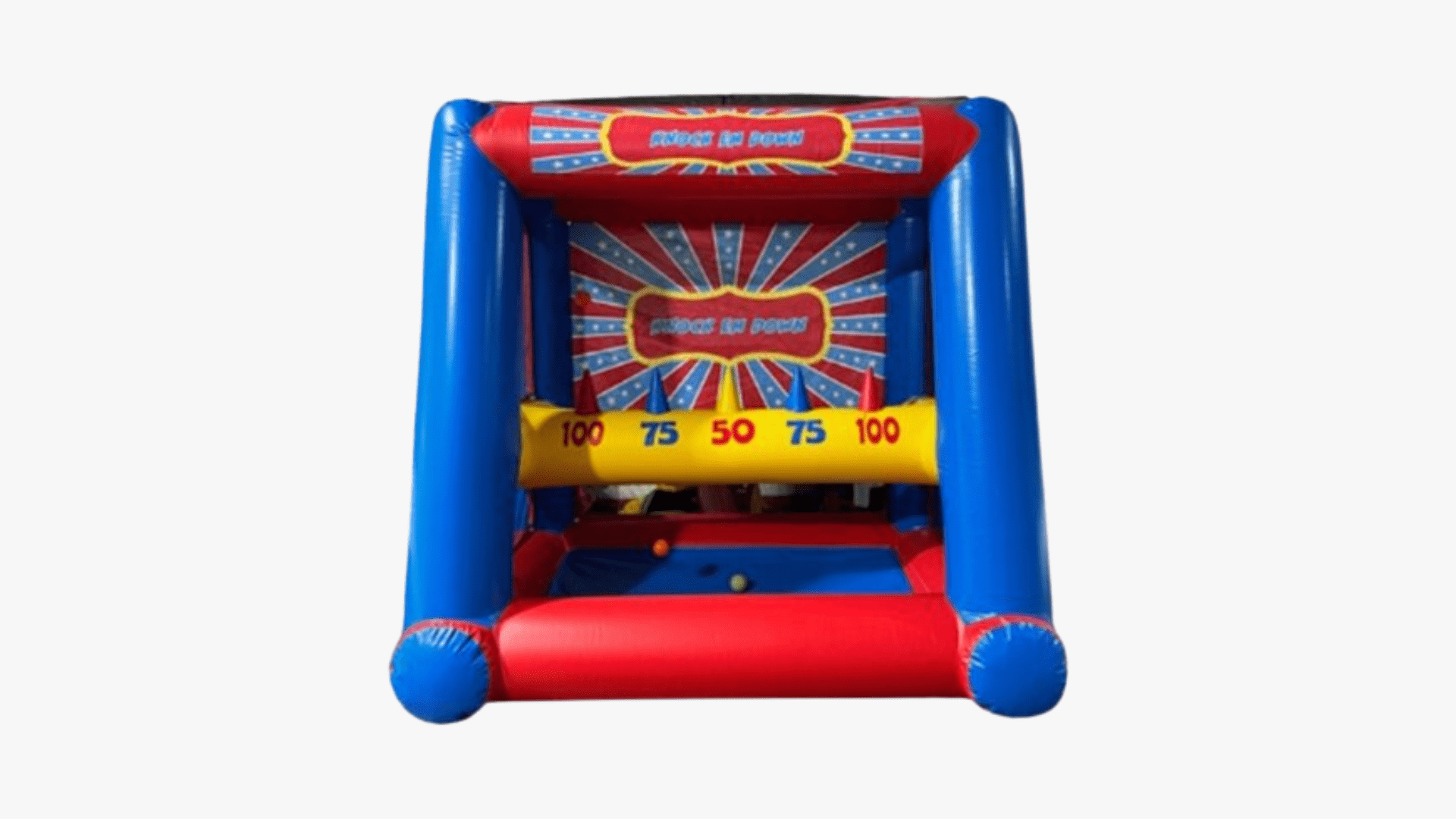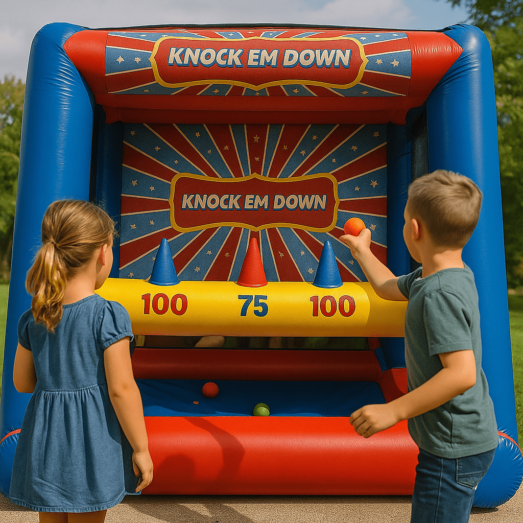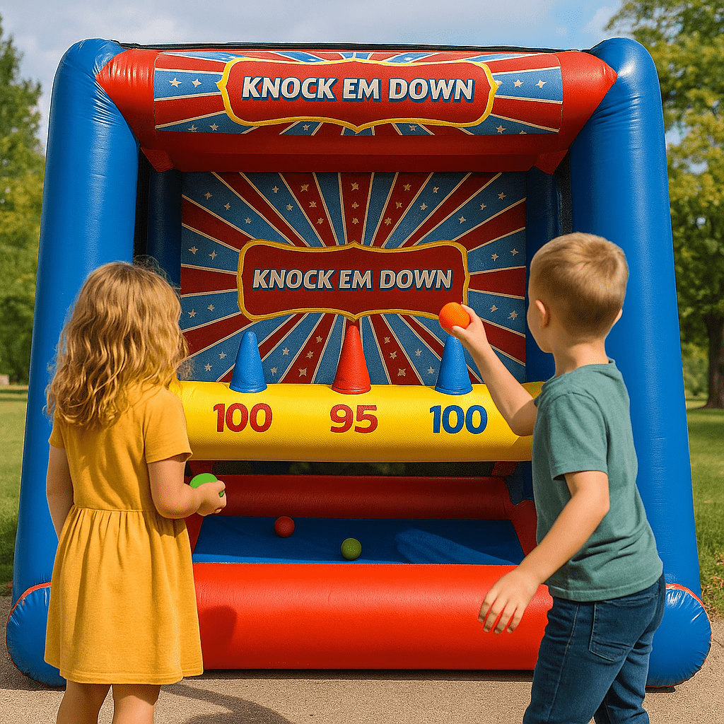 Looking for a thrilling crowd-pleaser? Our Knock ’Em Down inflatable features floating balls atop cones—guests toss bean bags to knock them down in fast-paced action. It’s vibrant, competitive, and draws cheers from players and spectators alike—perfect for carnivals, school fairs, backyard gatherings, or corporate picnics.
