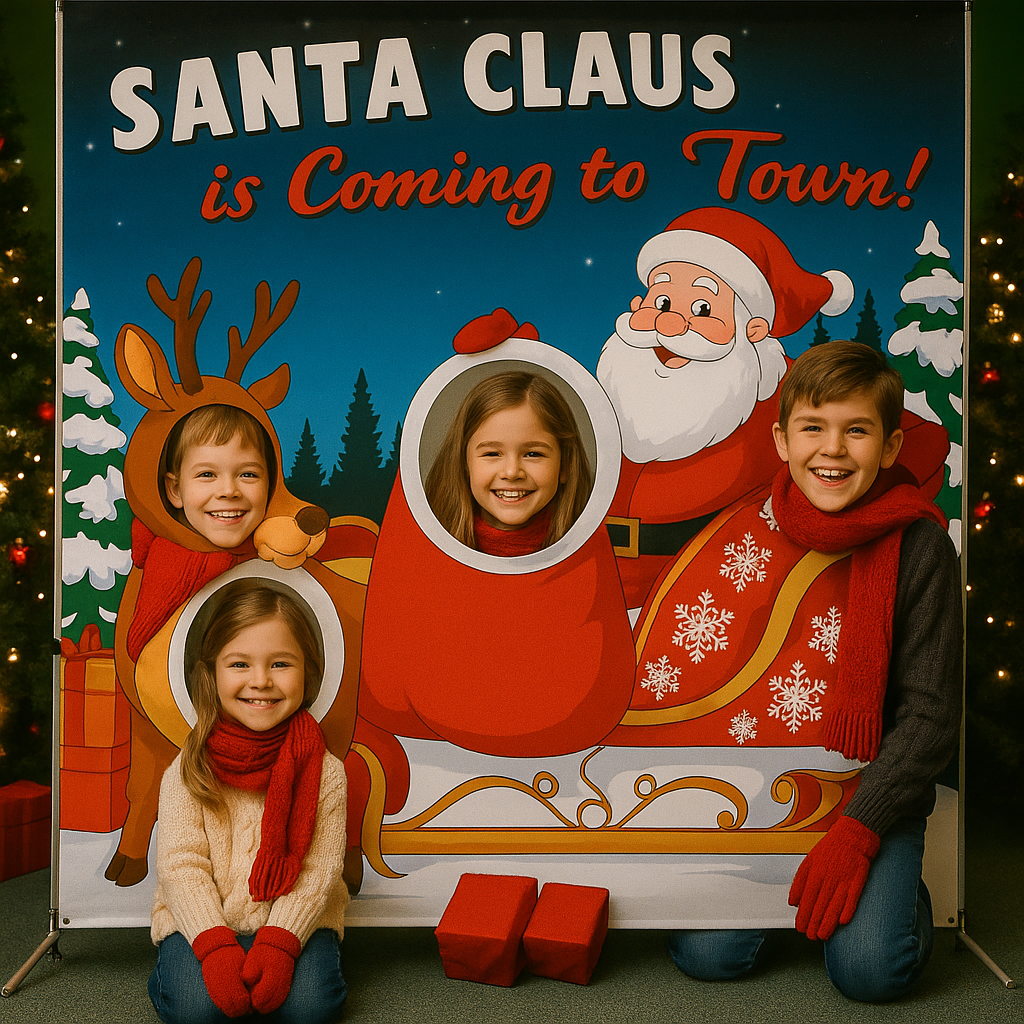 Its vibrant canvas backdrop and 7 × 7 ft freestanding frame set up in minutes—no power required—making it perfect for indoor lobbies or outdoor winter markets.